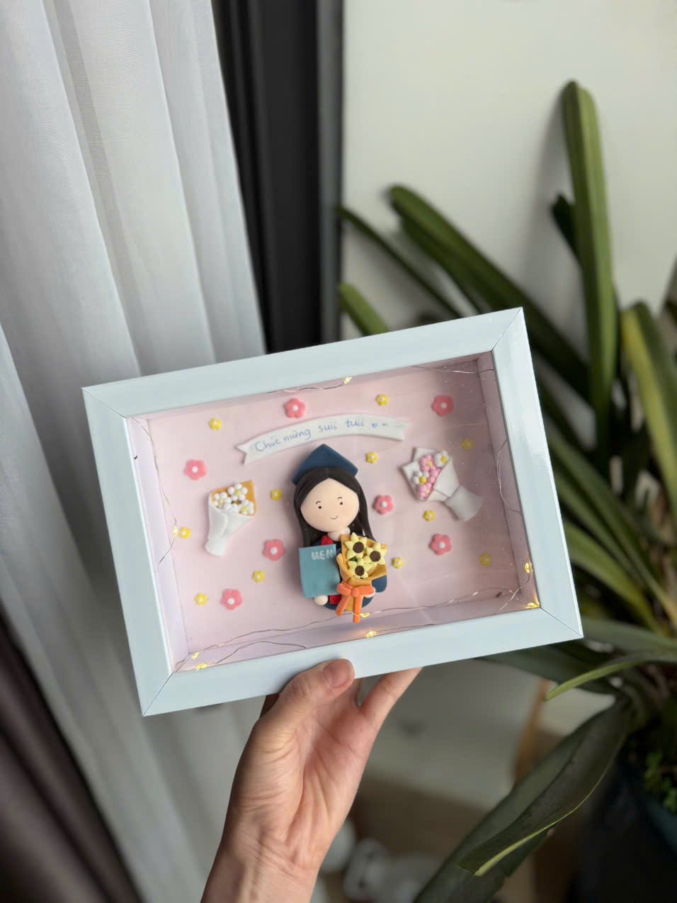 Chúng tôi nhận thiết kế khung ảnh tốt nghiệp handmade với tên, nhân vật mini, đèn LED và lời chúc riêng. Mỗi khung là một câu chuyện – dành riêng cho người bạn yêu thương.